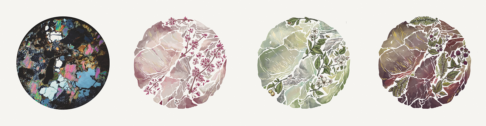 Each varietal depicts a different element of the vineyard within the hand-drawn custom illustrations, based on an image of Ankida's soil. The Rosé uses the redbuds that speckle the ridge in spring, the Chardonnay focuses on the pollinators and blooms of fruit trees, and the Pinot Noir uses foliage and fruit found on the forest floor. Each illustration is true to Ankida's terroir. Flecks of hot-stamped foil hide in the illustration, which adds depth to the design and further reflects the metallic nature of the soil sample that inspired it all.